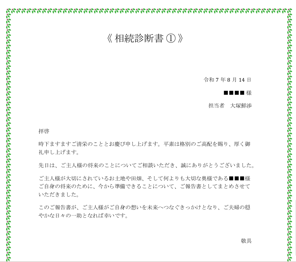 【相続診断書】という形で、今後起こり得る相続トラブルのリスクや、ご自身にもしもの事があった時にどんな手続きが必要になってくるのか、といった〝相続の手引書〟になるものを個別にお送りしています😌